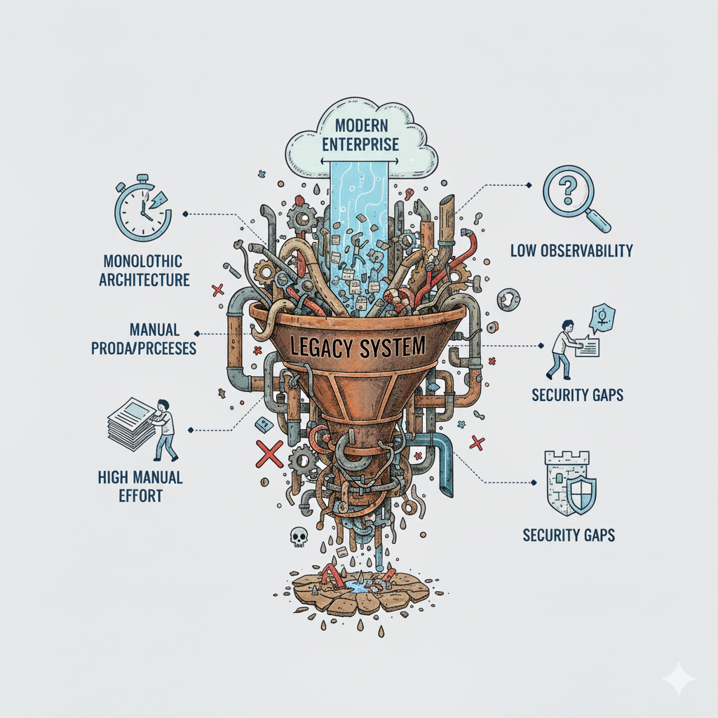 The complexity of the expanding enterprise was suffocating the IT infrastructure. Dependency on dated systems resulted in high operational costs and significant technical debt. The following specific pain points demanded immediate attention: